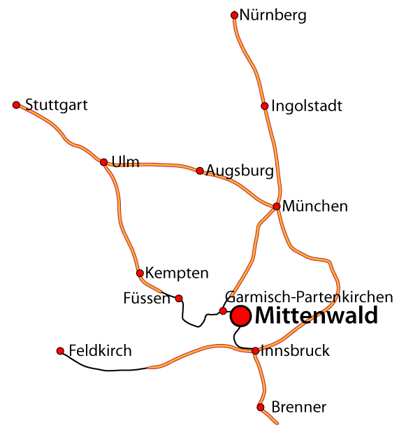 Wenn Sie der Autobahn nach Innsbruck (A) gefolgt sind, nehmen Sie ab dort die A12 (E60) in Richtung Landeck bis zur Abfahrt Zirl Ost (87). Verlassen Sie hier die Autobahn in Richtung Seefeld, Garmisch und folgen der Seefelder Bundesstraße B177 (E533), die ab dem Grenzort Scharnitz in die B2 übergeht. Nutzen Sie dann ebenfalls die Ausfahrt „Mittenwald Süd“ und folgen der Innsbrucker Straße in Richtung Ortsmitte. Kurz nachdem Sie den Abzweig in Richtung „Leutasch“ (auf der linken Seite) passiert haben, folgt als nächster Abzweig nach rechts der Mühlenweg, in den Sie dann abbiegen. Danach biegen Sie links auf „Beim Birnbaum“ und dann erneut links in den Mauthweg ab. Sobald der Mauthweg eine Rechtskurve beschreibt, finden Sie unser Haus etwas zurückversetzt auf der linken Seite.